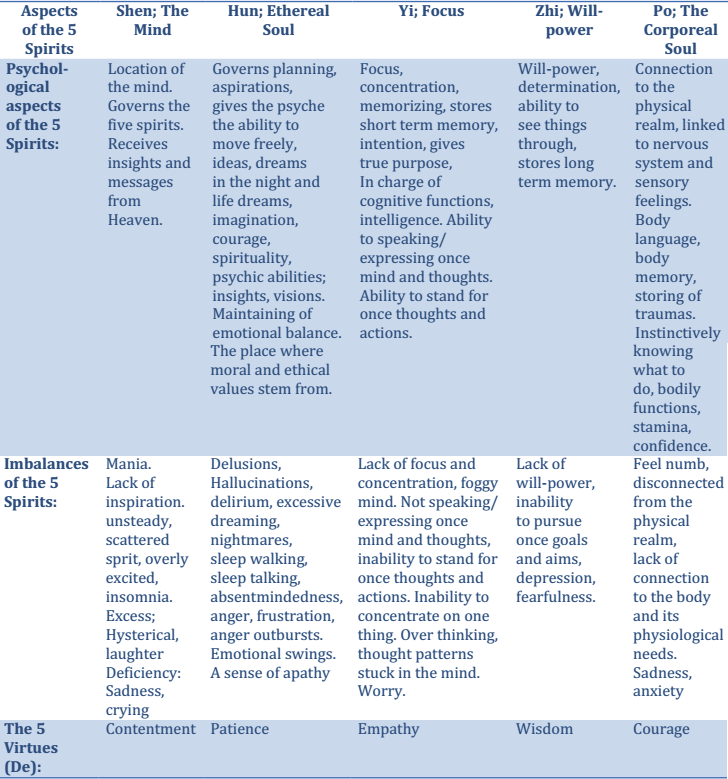 The 5 Spirits in balance, out of balance and their virtues: